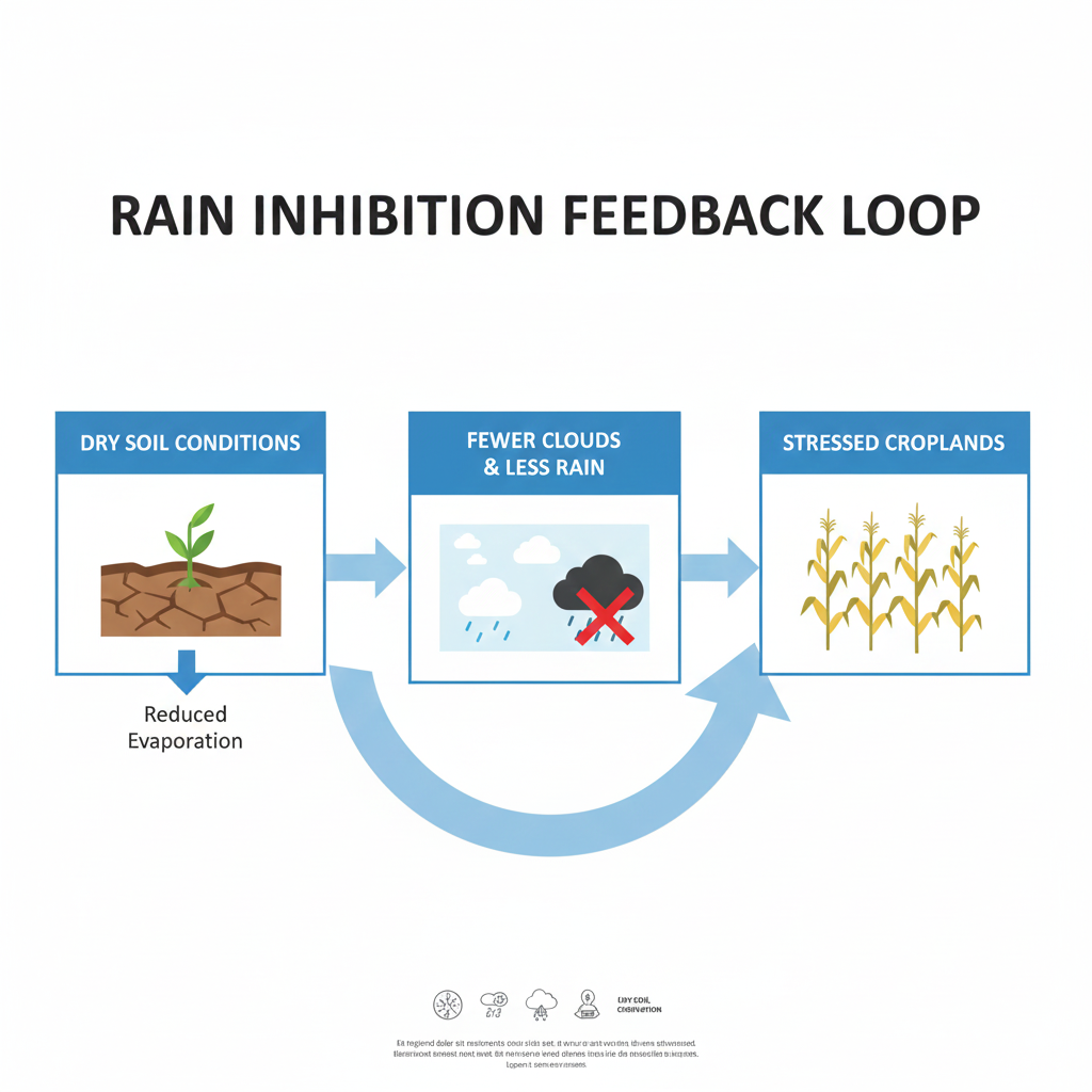 The U.S. Midwest and tropical East Africa emerge as hotspots due to heavy reliance on land moisture. In the Midwest, “rainfall feedback loops” amplify droughts as dry land reduces evaporation and future rain, threatening global grain markets. East Africa risks further instability from cropland expansion and rainforest loss, which undermine local moisture generation.